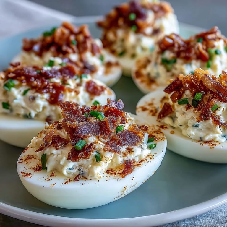 Save The hum of conversation always seemed to pause for a moment when I brought out a platter of Bacon Ranch Deviled Eggs. The first time I tried these, the aroma of freshly cooked bacon mingled with the tangy ranch scent was enough to draw everyone to the kitchen—even those claiming they weren’t hungry. There’s something about the creamy filling and savory crunch that feels festive without any fuss. I remember whisking the yolks with a fork, sneaking tastes and adjusting the ranch until it was just right—not too overpowering, but enough to thrill the palate. Each time, the anticipation was as much fun as the dish itself.