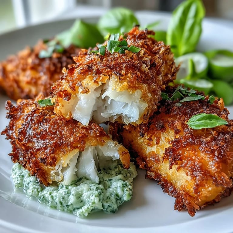 Save The first time I served these to my niece, she declared them better than any fish finger she'd ever had and asked if I could teach her to make them. We spent the next hour coating strips of fish together, her little hands pressing the breadcrumbs on with such concentration. Now every time she visits, she asks if we can make the fancy fish fingers with the green dip, and I never say no.
